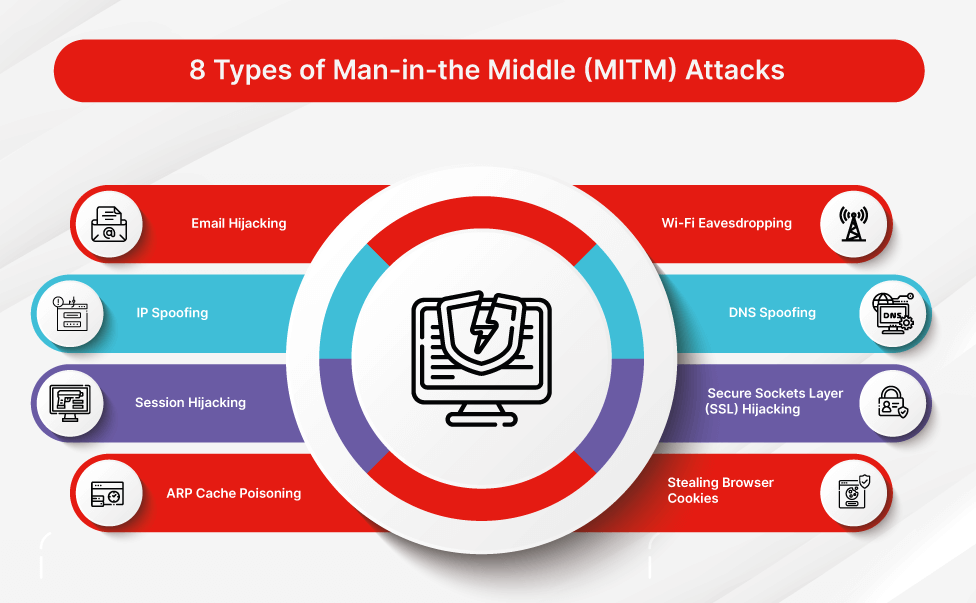 حمله MITM میتواند منجر به سرقت اطلاعات حساس مانند رمز عبور، اطلاعات کارت اعتباری، پیامهای خصوصی و دادههای محرمانه شود.